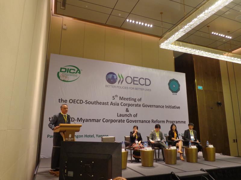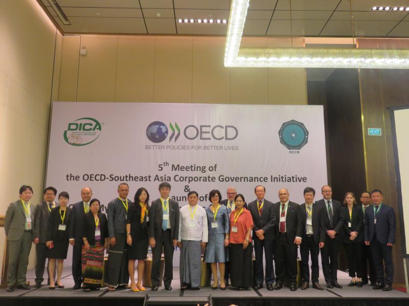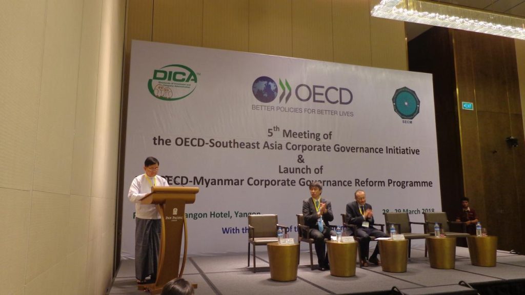 စီမံကိန်းနှင့်ဘဏ္ဍာရေးဝန်ကြီးဌာန၊ ရင်းနှီးမြှုပ်နှံမှုနှင့် ကုမ္ပဏီများညွှန်ကြားမှုဦးစီး ဌာန၊ ငွေချေးသက်သေခံလက်မှတ်လုပ်ငန်း ကြီးကြပ်ရေးကော်မရှင် (SECM)၊ စီးပွားရေး ပူးပေါင်းဆောင်ရွက်မှုနှင့် ဖွံ့ဖြိုးတိုးတက်မှုအဖွဲ့အစည်း (အိုအီးစီဒီ)နှင့် ဂျပန်နိုင်ငံ အစိုးရတို့၏ ပူးပေါင်းဆောင်ရွက်မှုဖြင့် (၅) ကြိမ်မြောက် OECD-Southeast Asia Corporate Governance Initiative အစည်းအဝေးကို ၂၀၁၈ခုနှစ် မတ်လ၂၈ ရက်နေ့တွင် Pan Pacific Hotel၊ ရန်ကုန်မြို့၌ ကျင်းပပြုလုပ်ခဲ့ပါသည်။
