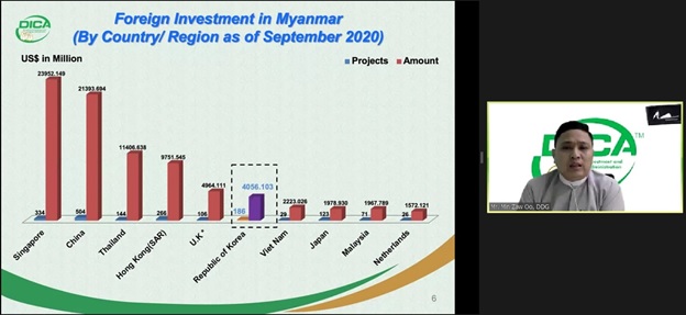 ရင်းနှီးမြှုပ်နှံမှုနှင့် နိုင်ငံခြားစီးပွားဆက်သွယ်ရေး ဝန်ကြီးဌာန၊ ရင်းနှီးမြှုပ်နှံမှုနှင့် ကုမ္ပဏီများညွှန်ကြားမှု ဦးစီးဌာန၊ ညွှန်ကြားရေးမှူးချုပ် ဦးသန့်စင်လွင်သည် Korea Trade-Investment Promotion Agency မှစီစဉ်ကျင်းပသည့် Myanmar Investment Forum (Webinar) သို့တက်ရောက်၍ အဖွင့်အမှာစကား ပြောကြားခဲ့ပါသည်။