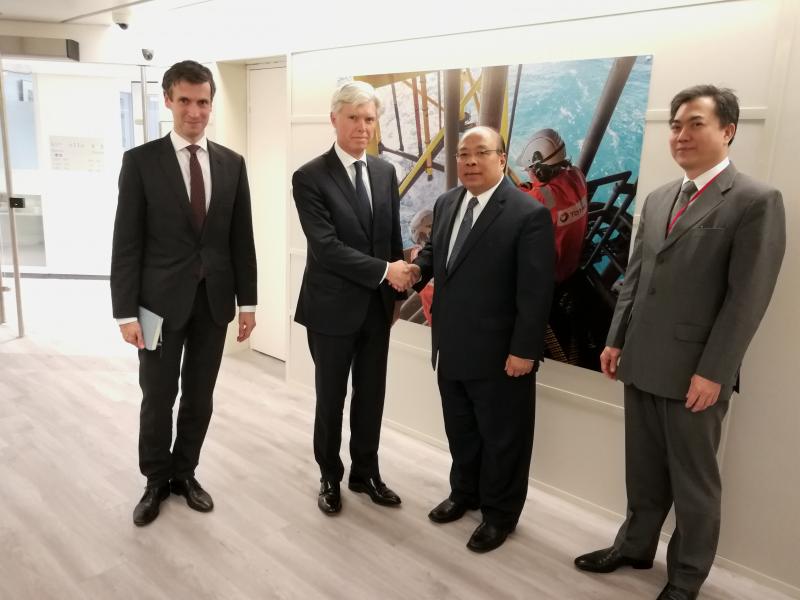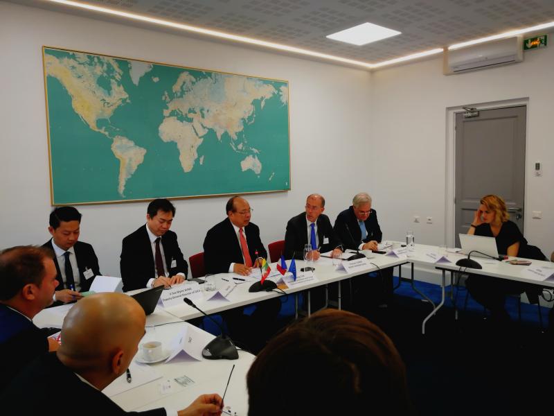 ပြည်ထောင်စုဝန်ကြီးသည် ၂၀၁၉ ခုနှစ် နိုဝင်ဘာလ ၁၉ ရက်နေ့တွင် ပြင်သစ်နိုင်ငံ၊ ပဲရစ်မြို့ရှိ Mouvement des Entreprises de France (MEDEF) ၌ ကျင်းပပြုလုပ်ခဲ့သည့် ပြင်သစ်လုပ်ငန်းရှင်များနှင့် တွေ့ဆုံဆွေးနွေးပွဲသို့ တက်ရောက်ခဲ့ပါသည်။ အဆိုပါဆွေးနွေးပွဲတွင် ပြည်ထောင်စုဝန်ကြီးက မြန်မာနိုင်ငံသည် တာဝန်ယူမှုရှိသည့် ရင်းနှီးမြှုပ်နှံမှု လုပ်ငန်းများကို ဖိတ်ခေါ်လျက်ရှိရာ ပြင်သစ်ကုမ္ပဏီများ မြန်မာနိုင်ငံသို့ လာရောက်ရင်းနှီးမြှုပ်နှံကြရန် ဖိတ်ခေါ်လိုကြောင်း၊ မြန်မာနိုင်ငံနှင့် ပြင်သစ်နိုင်ငံတို့အကြား လျှပ်စစ်၊ စွမ်းအင်၊ ရေနံနှင့်သဘာဝဓာတ်ငွေ့ကဏ္ဍ၊ ရေအရင်းအမြစ်နှင့် ပတ်ဝန်းကျင်သစ်တောစီမံခန့်ခွဲရေးကဏ္ဍတို့တွင် ပူးပေါင်း ဆောင်ရွက်လိုကြောင်းနှင့် မြန်မာနိုင်ငံ၏ ရင်းနှီးမြှုပ်နှံမှုဆိုင်ရာ အခွင့်အလမ်းများနှင့် ရင်းနှီးမြှုပ်နှံမှုဉီးစားပေးကဏ္ဍများနှင့်စပ်လျဉ်း၍ ဆွေးနွေးခဲ့သည်။