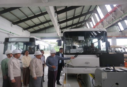 ပြည်ထောင်စုဝန်ကြီးနှင့်အဖွဲ့အား Daewoo Bus Myanmar စက်ရုံမှ မန်နေဂျင်းဒါရိုက်တာ ဦးကျော်ကျော်အောင်က ခရီးသည်တင် မော်တော်ယာဉ် ၂ မျိုး စမ်းသပ်ထုတ်လုပ်နေသည့် အခြေအနေ အား ရှင်းလင်းတင်ပြပါသည်။
