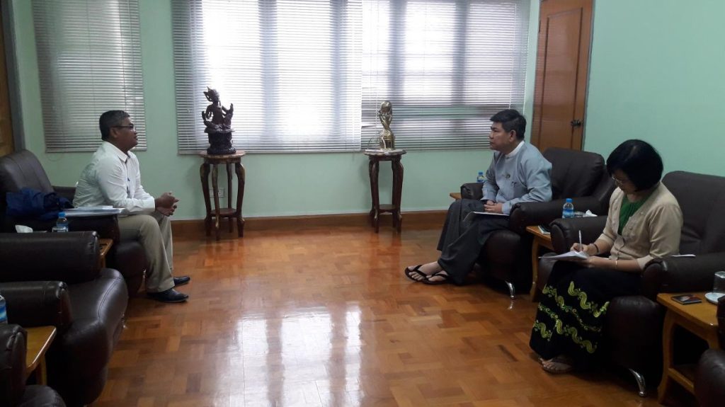 ရင်းနှီးမြှုပ်နှံမှုနှင့် ကုမ္ပဏီများညွှန်ကြားမှုဦးစီးဌာနမှ ညွှန်ကြားရေးမှူးချုပ် ဦးသန့်စင်လွင်သည် Royal Pole Start Services Co., Ltd. မှ မန်းနေဂျင်းဒါရိုက်တာ ဖြစ်သူ ဦးသိန်းဇော်အား ၂၀၁၉ ခုနှစ် သြဂုတ်လ ၅ ရက်နေ့တွင် ရန်ကုန်မြို့၌ လက်ခံတွေ့ဆုံခဲ့ပြီး ရင်းနှီးမြှုပ်နှံမှုဆိုင်ရာ ကိစ္စရပ်များနှင့် စပ်လျဉ်း၍ ဆွေးနွေးခဲ့ကြပါသည်။