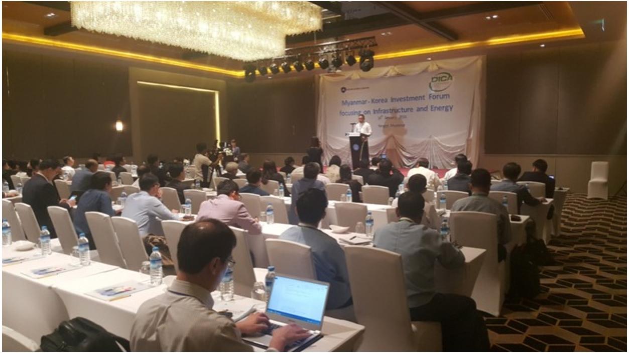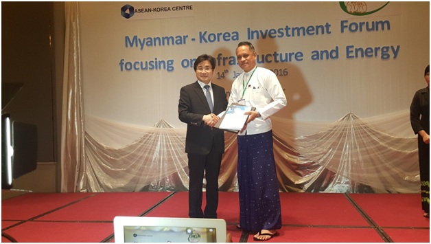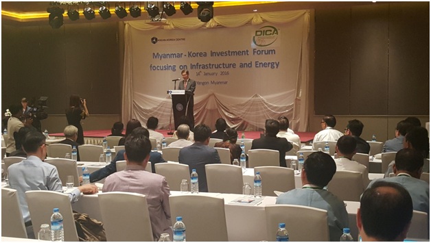 ရင်းနှီးမြှုပ်နှံမှုနှင့် ကုမ္ပဏီများညွှန်ကြားမှုဦးစီးဌာနနှင့် အာဆီယံ-ကိုရီးယားစင်တာတို့ ပူးပေါင်း၍ အခြေခံအဆောက်အအုံကဏ္ဍနှင့် စွမ်းအင်ကဏ္ဍတို့နှင့် စပ်လျဉ်းသည့် Myanmar-Korea Investment Forum ကို ၂၀၁၆ ခုနှစ် ဇန်နဝါရီလ ၁၄ ရက်နေ့ နံနက် (၈:၃၀) မှ ညနေ (၅:၃၀) နာရီ အထိ ရန်ကုန်မြို့ရှိ Novotel Yangon Max Hotel ၌ ကျင်းပပြုလုပ်ခဲ့ပါသည်။
