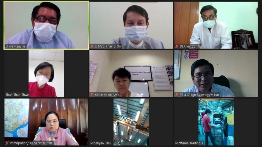 ရန်ကုန်တိုင်းဒေသကြီး ရင်းနှီးမြှုပ်နှံမှု လုပ်ငန်းများ ကြီးကြပ်ရေး အဖွဲ့မှ တာဝန်ရှိပုဂ္ဂိုလ်များ ပါဝင်သော စစ်ဆေးရေးအဖွဲ့သည် ရွှေပြည်သာမြို့နယ် နှင့် လှိုင်သာယာမြို့နယ် တို့တွင် လုပ်ငန်း ဆောင်ရွက်လျက်ရှိသော Min Dhama Steel Structures Co., Ltd , Myanmar C.P Livestock Co., Ltd နှင့် Weijie (Myanmar) Clothing Co., Ltd တို့အား Coronavirus Disease 2019(COVID-19) ရောဂါ ကာကွယ် ထိန်းချုပ်ရေးနှင့် ပတ်သက်၍ ကျန်းမာရေးနှင့် အားကစား ဝန်ကြီးဌာန၏ လမ်းညွှန်ချက် များဖြစ်သည့် စက်ရုံ၊ အလုပ်ရုံများ၊ လုပ်ငန်းခွင်များ၊ အလုပ်ဌာနများတွင် အထူး ဂရုပြု လိုက်နာရမည့် အချက်များအား လိုက်နာ ဆောင်ရွက် ထားရှိမှု အခြေအနေကို ၂၀၂၀ ပြည့်နှစ် နိုဝင်ဘာလ ၃ ရက်နေ့တွင် video conferencing system အသုံးပြု၍ စစ်ဆေးပြီး လိုအပ်သည် များကို ပေါင်းစပ် ညှိနှိုင်း ဆောင်ရွက်ပေးခဲ့ပါသည်။