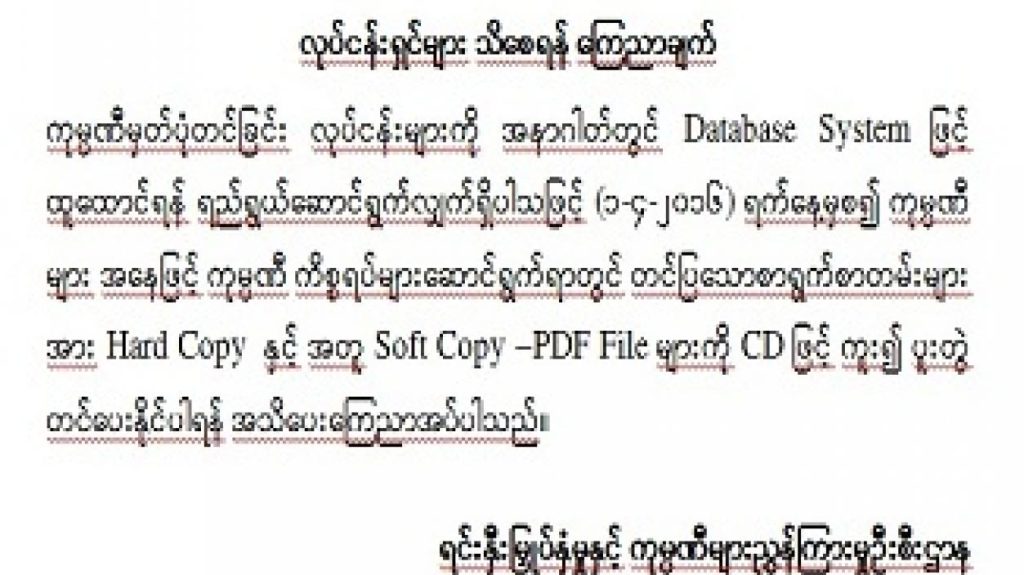 ကုမ္ပဏီမှတ်ပုံတင်ခြင်း လုပ်ငန်းများကို အနာဂါတ်တွင် Database System ဖြင့် ထူထောင်ရန် ရည်ရွယ်ဆောင်ရွက်လျှက်ရှိပါသဖြင့် (၁-၄-၂၀၁၆) ရက်နေ့မှစ၍ ကုမ္ပဏီ များ အနေဖြင့် ကုမ္ပဏီ ကိစ္စရပ်များဆောင်ရွက်ရာတွင် တင်ပြသောစာရွက်စာတမ်းများ အား Hard Copy နှင့် အတူ Soft Copy –PDF File များကို CD ဖြင့် ကူး၍ ပူးတွဲ တင်ပေးနိုင်ပါရန် အသိပေးကြေညာအပ်ပါသည်။