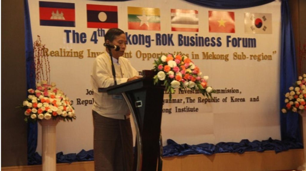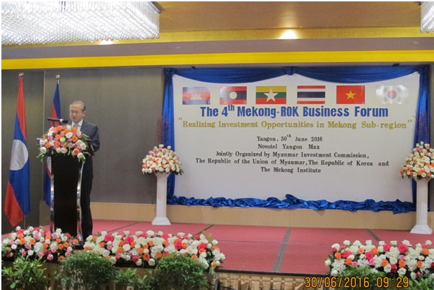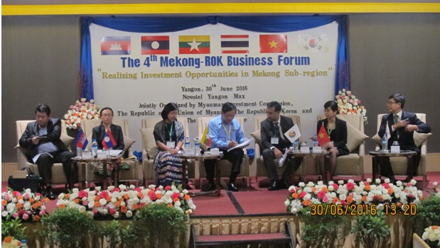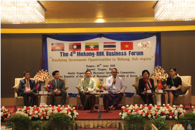 မြန်မာနိုင်ငံ ရင်းနှီးမြှုပ်နှံမှု ကော်မရှင်၊ ကိုရီးယားသမ္မတနိုင်ငံ နိုင်ငံခြားရေး ဝန်ကြီးဌာနနှင့် Mekong Institute တို့ ပူးပေါင်း၍ စတုတ္တအကြိမ်မြောက် Mekong-ROK Business Forum ကို “Realizing Investment Opportunities in Mekong Sub-region” ခေါင်းစဉ်ဖြင့် ၂၀၁၆ ခုနှစ်၊ ဇွန်လ (၃၀)ရက်နေ့ နံနက်ပိုင်းတွင် ရန်ကုန်မြို့ရှိ Novotel Yangon Max ဟိုတယ်၌ ကျင်းပပြုလုပ်ခဲ့ပါသည်။