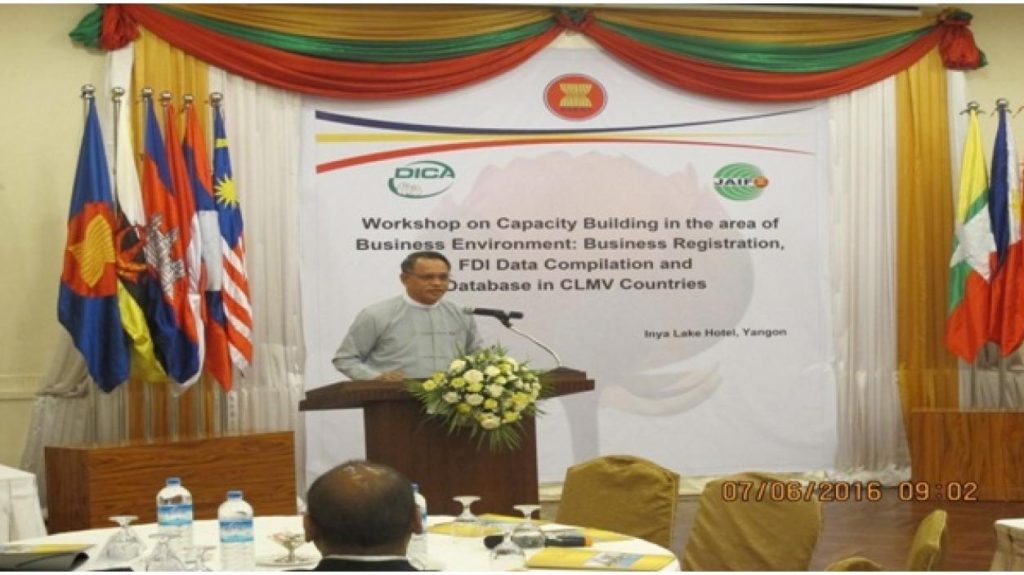 ၂၀၁၆ ခုနှစ် ဇွန်လ ၇ ရက်နေ့ နံနက် (၉:၀၀) နာရီတွင် ရန်ကုန်မြို့ အင်းယားလိပ် ဟိုတယ်၌ Japan-ASEAN Integrated Fund နှင့် အာဆီယံအတွင်းရေးမှူးချုပ်ရုံးတို့မှ နည်းပညာအထောက်အပံ့အဖြစ် စီအယ်လ်အမ်ဗွီနိုင်ငံများ၏ စီးပွားရေးလုပ်ငန်းများ မှတ်ပုံတင် ခြင်း၊ နိုင်ငံခြားတိုက်ရိုက်ရင်းနှီးမြှုပ်နှံမှု စာရင်းအင်းအချက်အလက်များ ကောက်ယူခြင်းနှင့် စပ်လျဉ်းသည့် Database အလုပ်ရုံဆွေးနွေးပွဲအား ကျင်းပခဲ့ပါသည်။ ထိုအလုပ်ရုံ ဆွေးနွေးပွဲ ဖွင့်ပွဲ အခမ်းအနား၌ ရင်းနှီးမြှပ်နှံမှုနှင့်ကုမ္ပဏီများညွှန်ကြားမှု ဦးစီးဌာနမှ ညွှန်ကြားရေးမှူးချုပ် ဦးအောင်နိုင်ဦးမှ အဖွင့်အမှာစကား ပြောကြားခဲ့ပါသည်။ အဆိုပါ အလုပ်ရုံဆွေးနွေးပွဲသို့ ရင်းနှီး မြှုပ်နှံမှုနှင့်ကုမ္ပဏီများညွှန်ကြားမှုဦးစီးဌာနမှ ဝန်ထမ်းများသာမက အခြား အာဆီယံအဖွဲ့ဝင် နိုင်ငံများမှ ကိုယ်စားလှယ်များ စုစုပေါင်း(၃၅)ဦး တက်ရောက်ခဲ့ပါသည်။