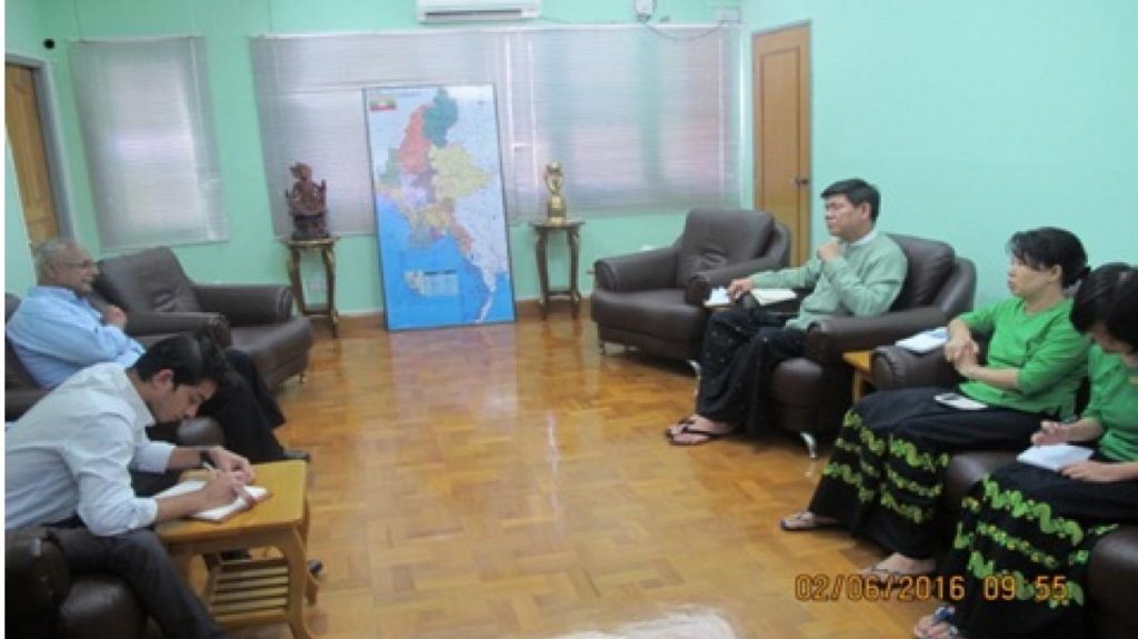 United Nations Industrials Development Organization (UNIDO) အဖွဲ့မှ ကိုယ်စားလှယ်ဖြစ်သူ Mr. P.D. Kaushik သည် ၂-၆-၂၀၁၆ ရက်နေ့ နံနက် ၁၀ နာရီတွင် အမှတ်(၁)၊ သစ္စာလမ်း၊ ရန်ကင်းမြို့နယ် ရန်ကုန်မြို့ရှိ ရင်းနှီးမြှုပ်နှံမှုနှင့်ကုမ္ပဏီများ ညွှန်ကြားမှု ဦးစီးဌာနသို့ လာရောက်၍ အသစ်ပြဌာန်းမည့် မြန်မာရင်းနှီးမြှုပ်နှံမှုဥပဒေ၊ မြန်မာနိုင်ငံ ရင်းနှီး မြှုပ်နှံမှုကော်မရှင်မှ ခွင့်ပြုခဲ့သည့် ရင်းနှီးမြှုပ်နှံမှုဆိုင်ရာစာရင်း အချက်အလက် များနှင့် စပ်လျဉ်း၍ ဆွေးနွေးခဲ့ကြပါသည်။