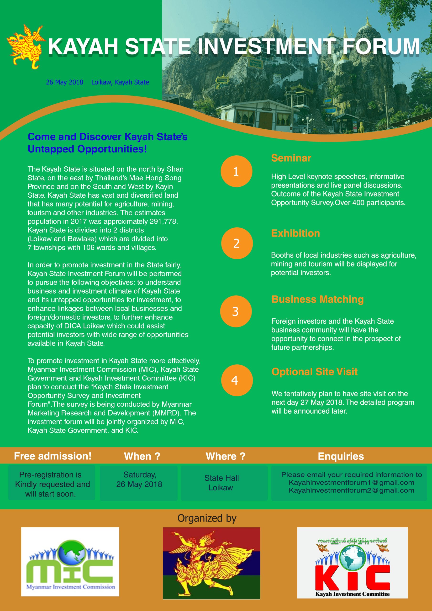 Flyer for Kayah State Investment Forumဧပြီ 24, 2018ကြေငြာချက်နှင့်သတင်းအချက်အလက်များ Home ကြေငြာချက်နှင့်သတင်းအချက်အလက်များ Flyer for Kayah State Investment Forum kayahstate_investment_forum_2-1Download