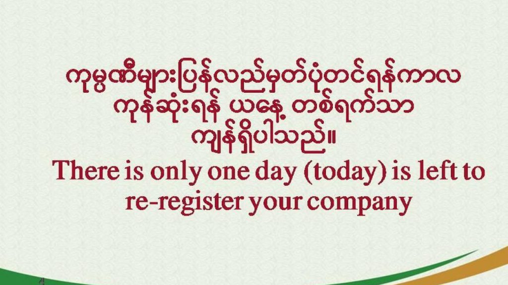 ယခုအခါ ပြန်လည်မှတ်ပုံတင်ရန်ကာလ ကုန်ဆုံးရန် ယနေ့ ၁ ရက်သာ ကျန်ရှိပါသဖြင့် အဆိုပါ ကုမ္ပဏီများနှင့်အဖွဲ့အစည်းများအနေဖြင့် သတ်မှတ်ချိန်အတွင်း အချိန်မီပြန်လည်မှတ်ပုံတင် ဆောင်ရွက်နိုင်ကြပါရန် ထပ်မံတိုက်တွန်းနှိုးဆော်အပ်ပါသည်။